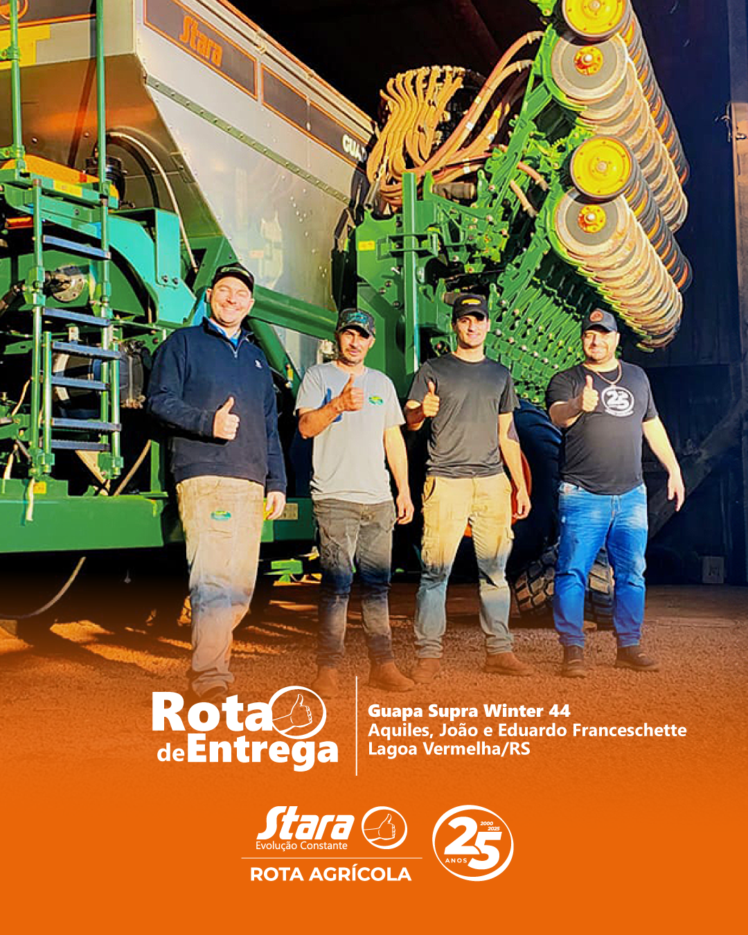 Parabéns aos amigos Aquiles, João e Eduardo e toda a família Francheschette pela excelente escolha. Desejamos muito sucesso e produtividade com a nova a semeadora.💪